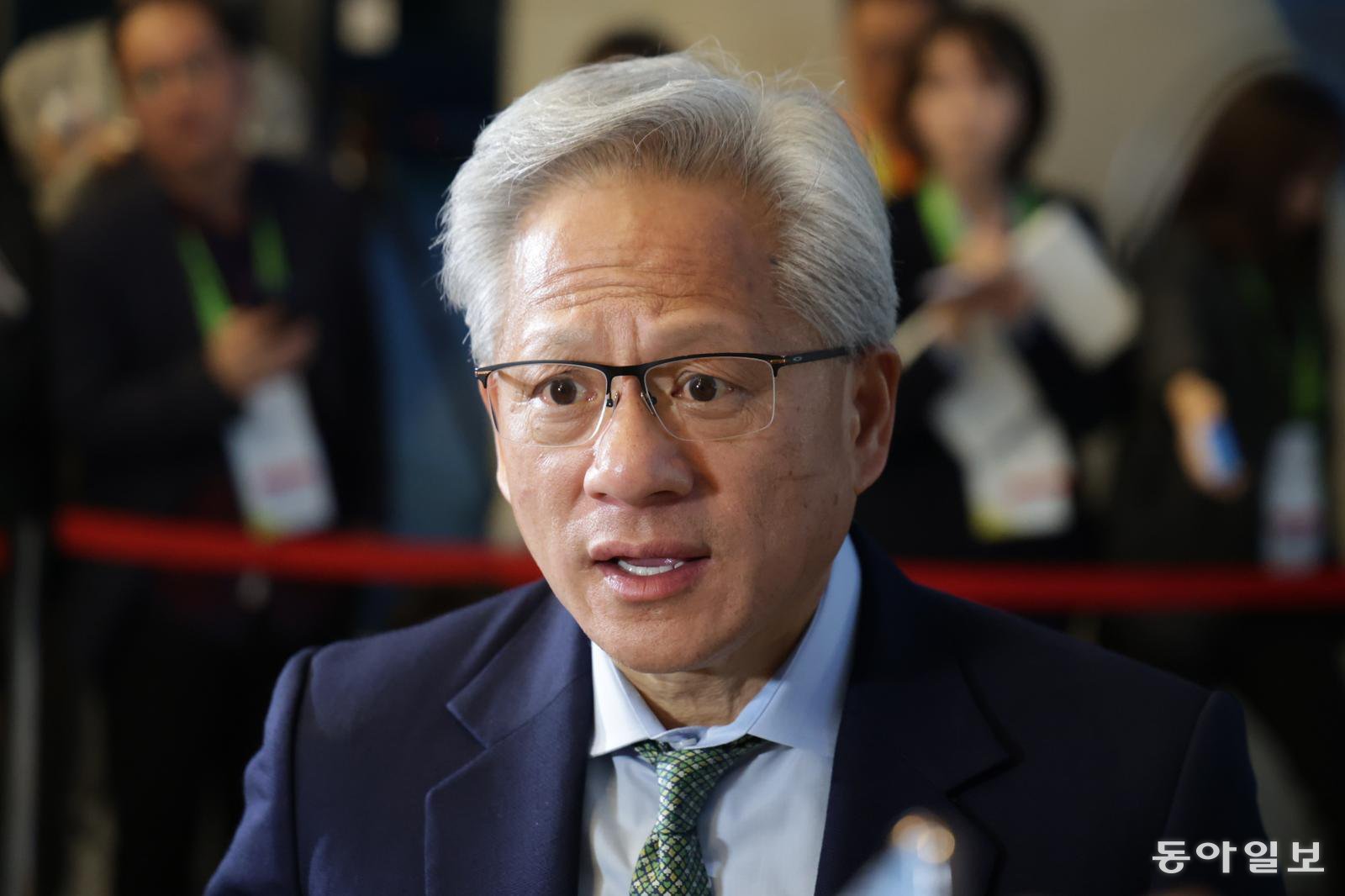 젠슨 황 엔비디아 최고경영자(CEO)가 31일 경북 경주시 경주예술의전당 원화홀에서 열린 엔비디아 기자회견에 앞서 방송 인터뷰를 진행하고 있다. 박형기 기자 onehsot@donga.com