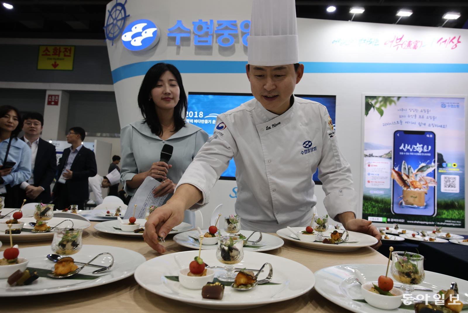 7일 오전 서울 양재동 aT센터에서 열린 ‘2025 씨팜쇼’에서 시민들이 수협 부스를 관람하고 있다. 송은석 기자 silverstone@donga.com수협 홍보관에서는 ‘컬링 이벤트’가 열렸다. 수협 로고에 컬링 스톤이 정확히 도달하면 상품을 증정하는 행사로 인기를 끌었다. 이필우 셰프는 메기와 참돔을 활용한 즉석 요리를 선보여 참석 내빈들이 시식을 하기도 했다.