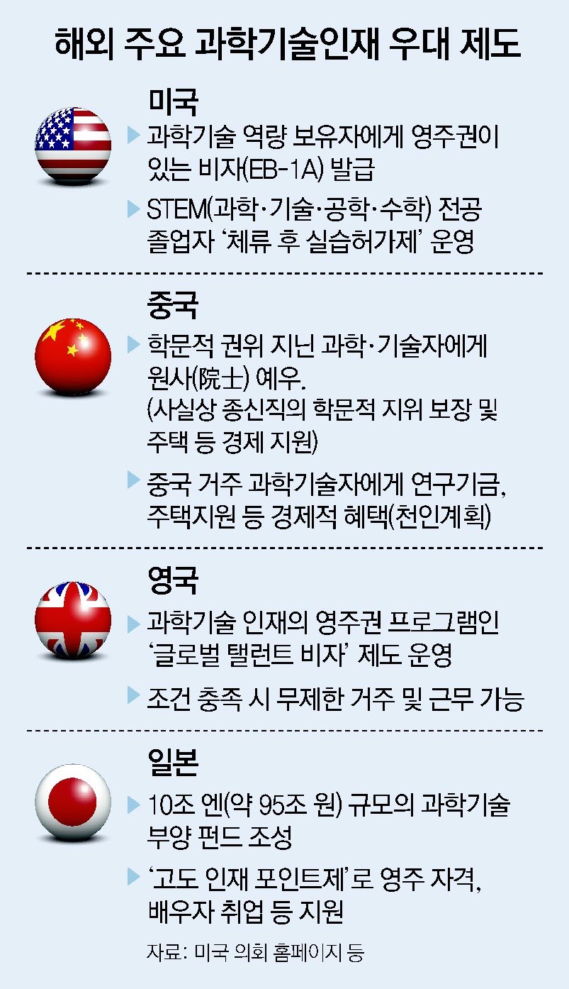 한편 과학기술 인재에 대한 지원은 현재 전 세계에서 공통적으로 벌어지는 현상이다. 이민자에게 빗장을 걸어잠그고 있는 미국도 과학기술 인재에게만은 문호를 지속적으로 개방하고 있다. 검증된 과학기술자에 대해 영주권이 있는 비자(EB-1A)를 발급해 주고 과학, 기술, 공학, 수학 등 이른바 ‘스템(STEM)’ 학과 전공 졸업자들에게는 ‘체류 후 실습허가제’를 운영해 비STEM 전공자보다 더 긴 체류 기간을 제공하거나 일부 취업을 허가해 준다.