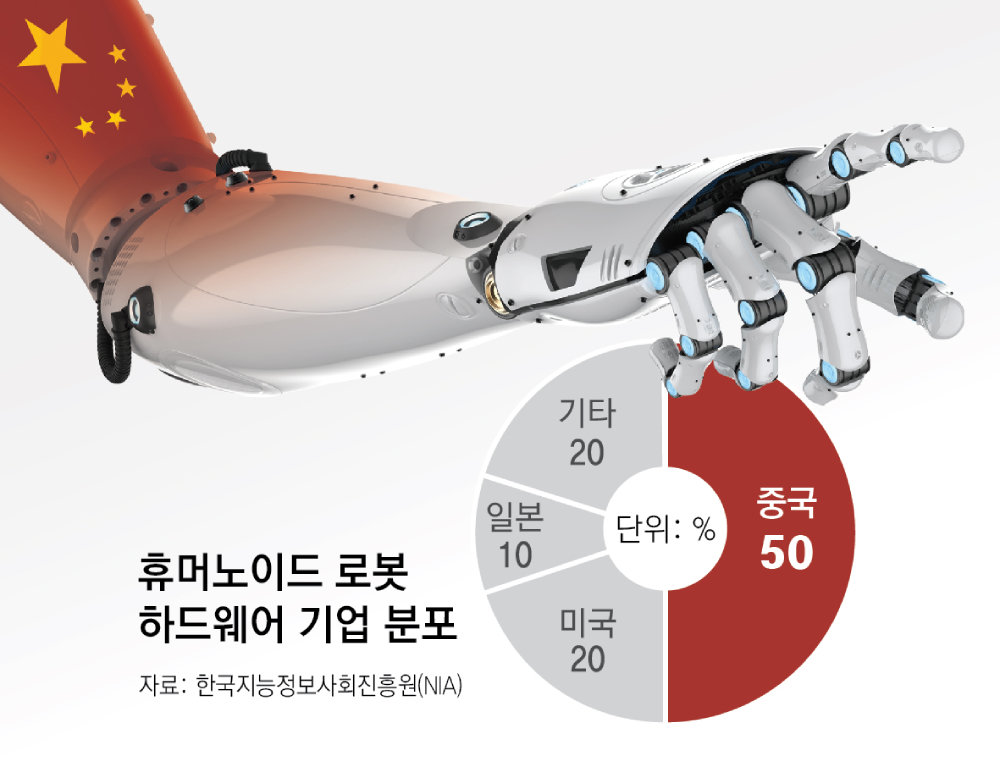 중국은 로봇 하드웨어를 구성하는 부품의 90%를 국산화했다. 실제 일본의 컨설팅 기업인 노무라종합연구소에 따르면 지난해 12월 기준 사람과 유사한 형태의 로봇인 ‘휴머노이드’ 본체를 개발하는 기업의 절반은 중국 기업이었다. 국내 한 전문가는 “같은 로봇을 만든다고 하더라도 미국에서 만들려면 중국에서 부품을 다 조달해 와야 하기 때문에 가격이 높아진다”며 “중국의 로봇 생태계가 빠르게 확장되는 배경”이라고 설명했다.