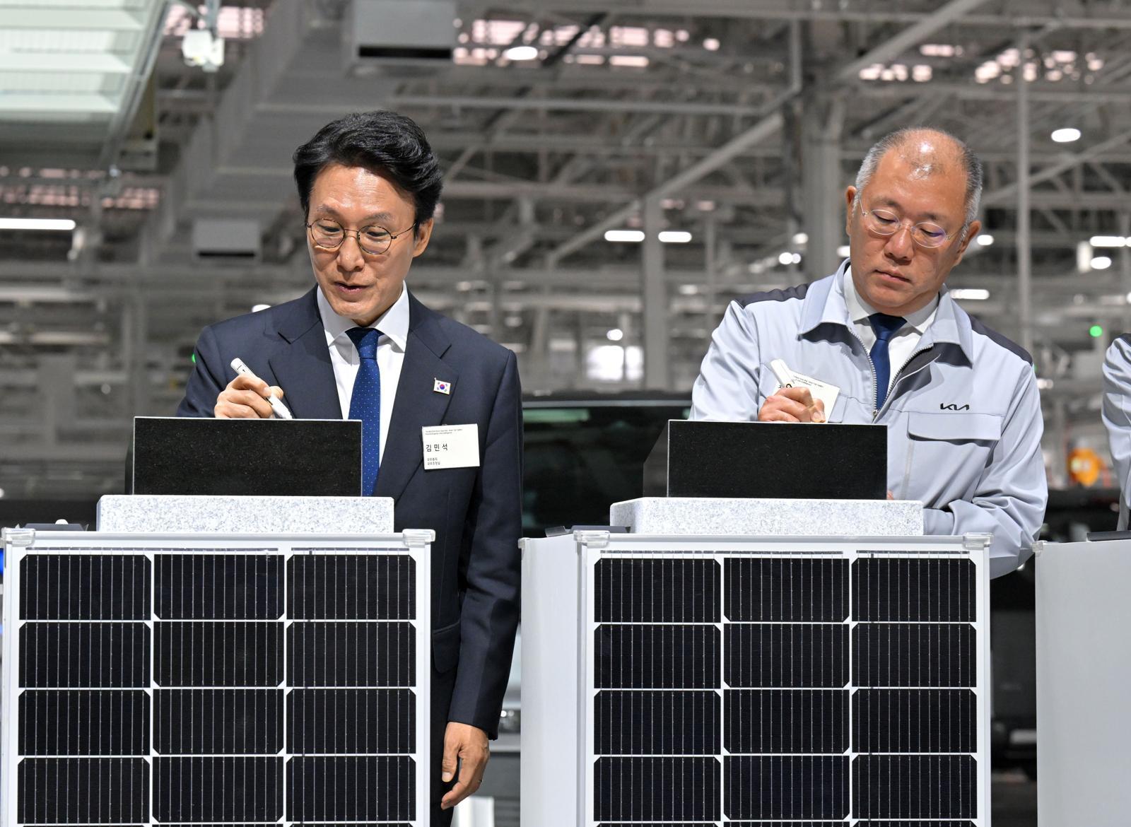14일 경기 화성시에서 진행된 기아 ‘이보 플랜트’ 이스트동 준공식 및 웨스트동 기공식에 참석한 김민석 국무총리(왼쪽)와 정의선 현대차그룹 회장이 표지석에 서명을 하고 있다. 사진공동취재단