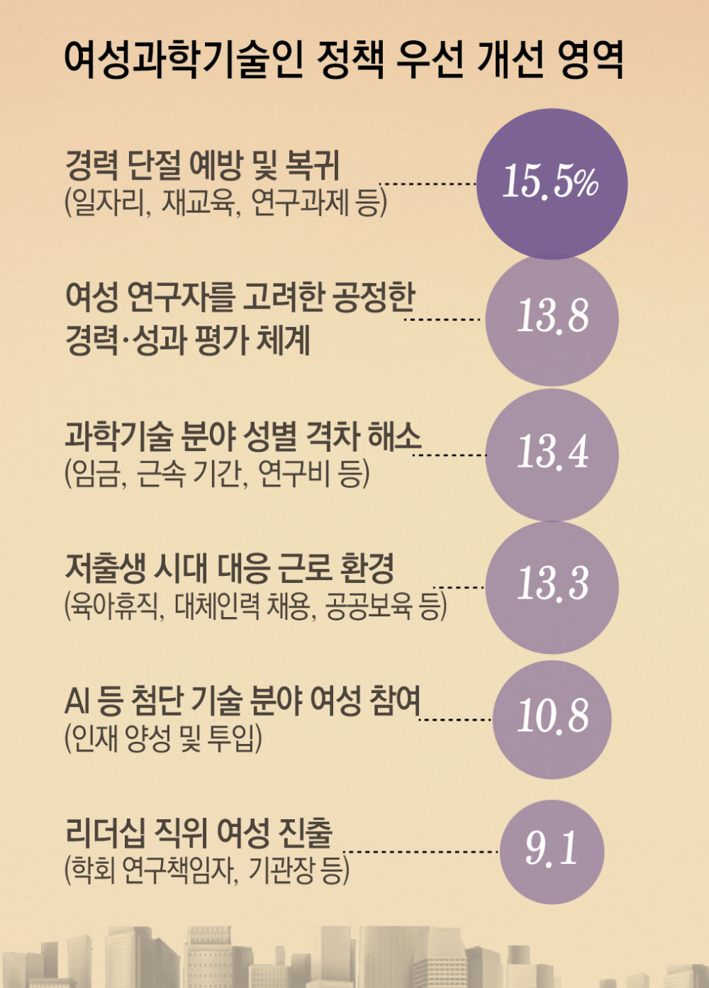 ‘여성과학기술인 정책 우선 개선 영역’을 묻는 질문에서는 경력 단절 예방 및 복귀(일자리, 재교육, 연구과제 등)가 필요하단 응답이 15.5%로 가장 높게 나타났다. 이어 △여성 연구자를 고려한 공정한 경력·성과 평가 체계(13.8%) △임금·근속기간·연구비의 성별 격차 해소(13.4%) 등이 뒤를 이었다.