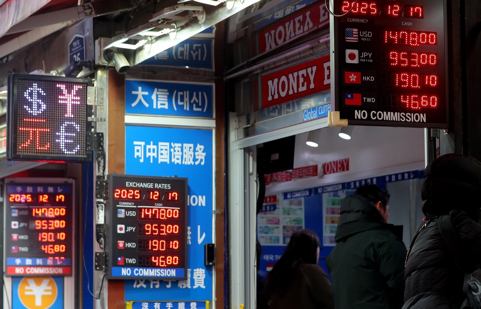 [서울=뉴시스] 김혜진 기자 = 원·달러 환율이 장중 1480원을 돌파하며 8개월 만에 최고 수준으로 오른 17일 서울 중구 명동의 한 환전소에 거래 가격이 표시돼 있다. 2025.12.17. jini@newsis.com