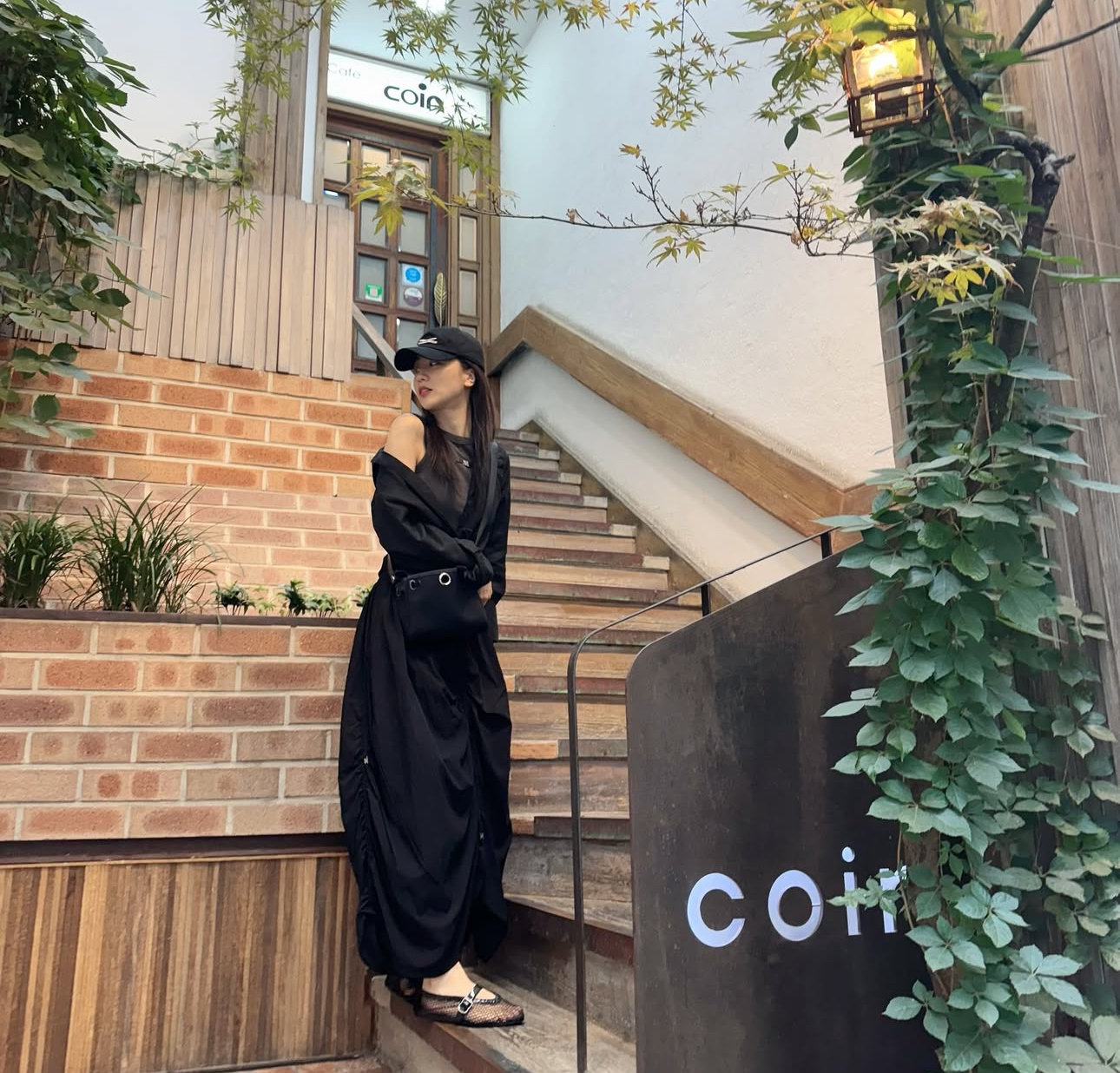 사진 속 박하선은 올블랙 패션을 소화했다.