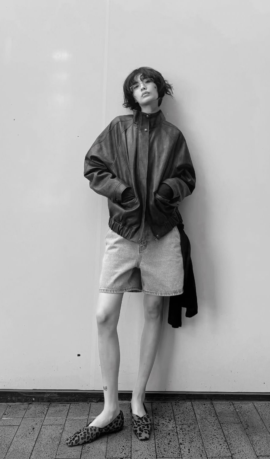 사진 속 나나는 가죽 자켓을 입고 있다.
