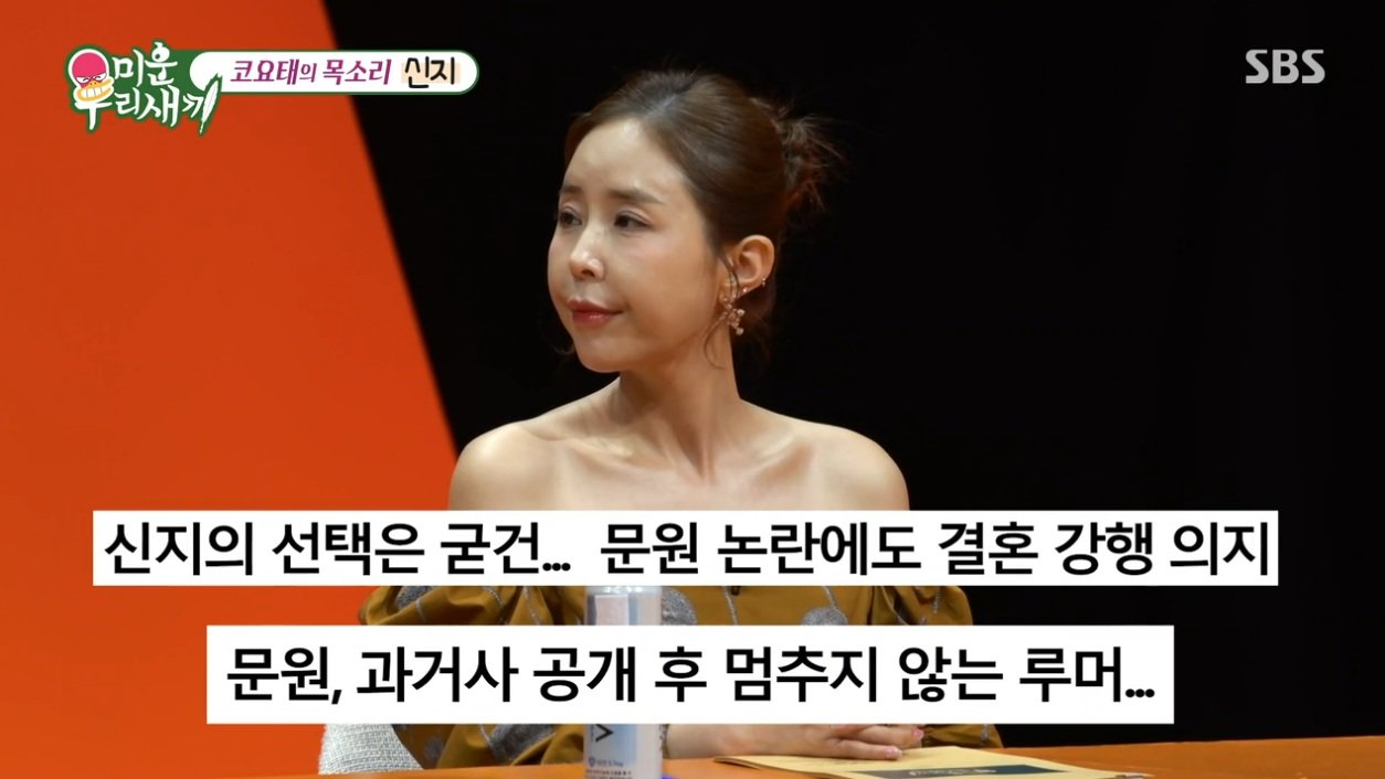 이날 서장훈은 “7살 연하 문원과 결혼을 앞두고 있는데 결혼 발표 당시 남편을 향한 논란 때문에 마음고생을 하지 않았냐”고 물었다.
