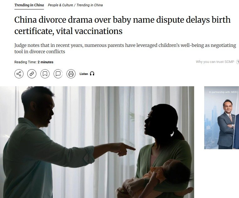 중국에서 신혼부부가 갓 태어난 아이의 이름을 두고 1년 이상 싸우다 결국 이혼 소송을 벌이고 있다고 사우스차이나모닝포스트(SCMP)가 22일 보도했다.