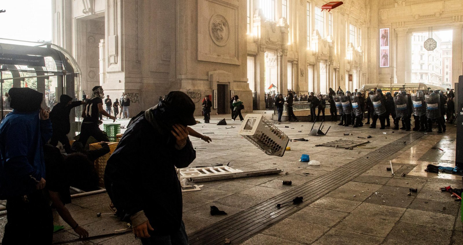 22일 이탈리아 밀라노 중앙역에서 팔레스타인 지지 시위대가 진압 경찰을 향해 집기들을 내던지고 있다. 시위 주최 측은 밀라노에서만 약 5만 명이 팔레스타인 지지 행진을 벌였다고 밝혔다. 최근 영국, 프랑스가 이스라엘의 가자 공습을 규탄하며 팔레스타인 국가 인정에 나섰지만, 조르자 멜로니 이탈리아 총리가 이에 동참하지 않자 이탈리아 전역에서 반정부 시위가 벌어졌다. 밀라노=AP뉴시스