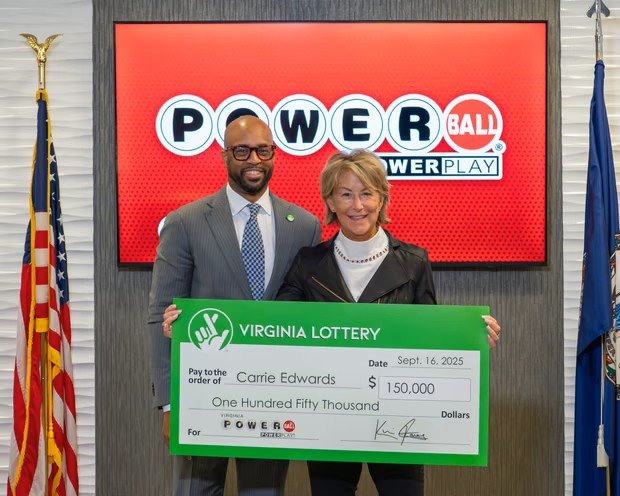 캐리 에드워즈(오른쪽)가 버지니아 복권국 칼리드 존스 국장으로부터 당첨금 증서를 받고 있다. [Virginia Lottery]