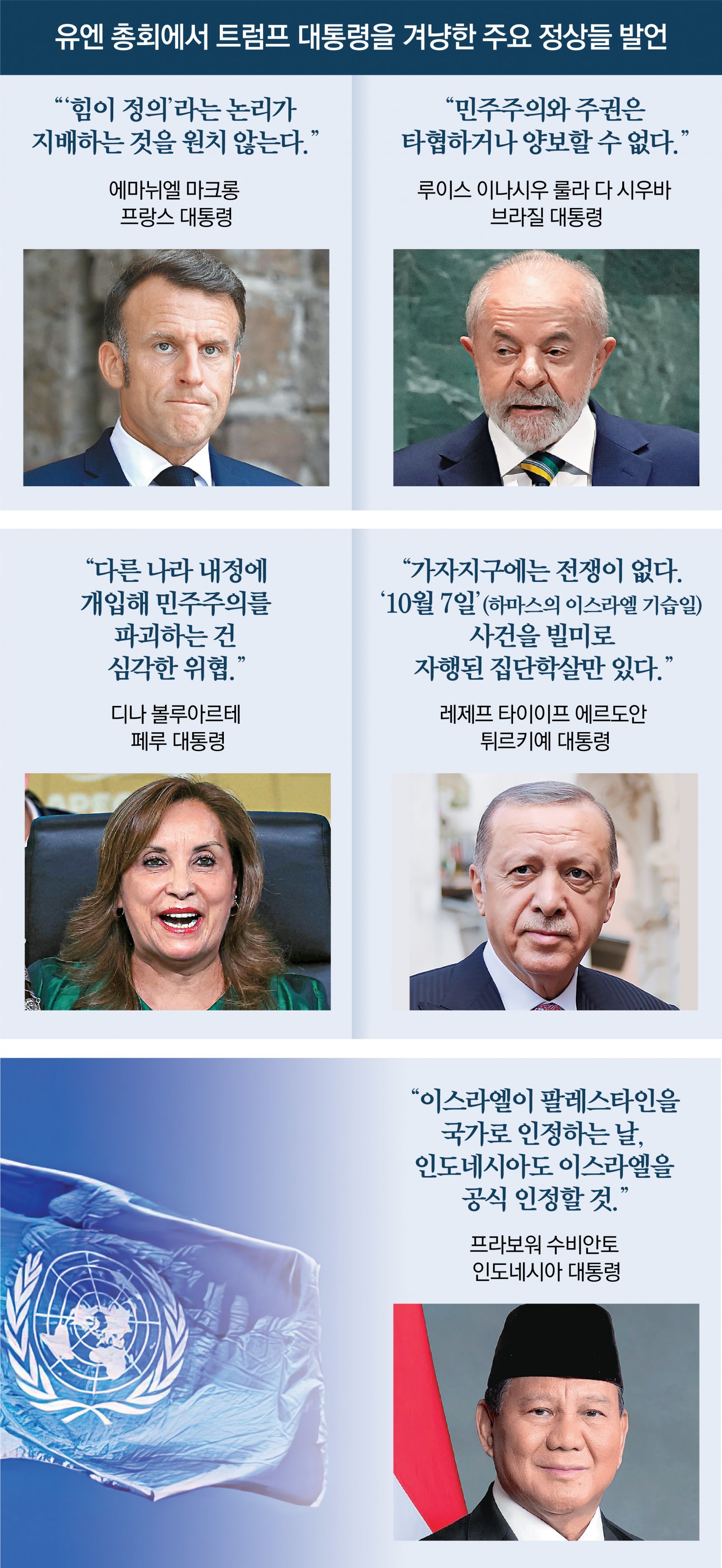 23일 미국 뉴욕에서 열린 제80차 유엔 총회에서 브라질, 프랑스, 튀르키예, 페루, 인도네시아 정상이 한목소리로 도널드 트럼프 미국 대통령을 비판했다. 이들은 트럼프 대통령의 ‘미국 우선주의’ 정책, 친(親)이스라엘 기조, 타국에 대한 내정 간섭 시도 등을 지적하며 총회장을 일종의 ‘트럼프 성토장’으로 만들었다.