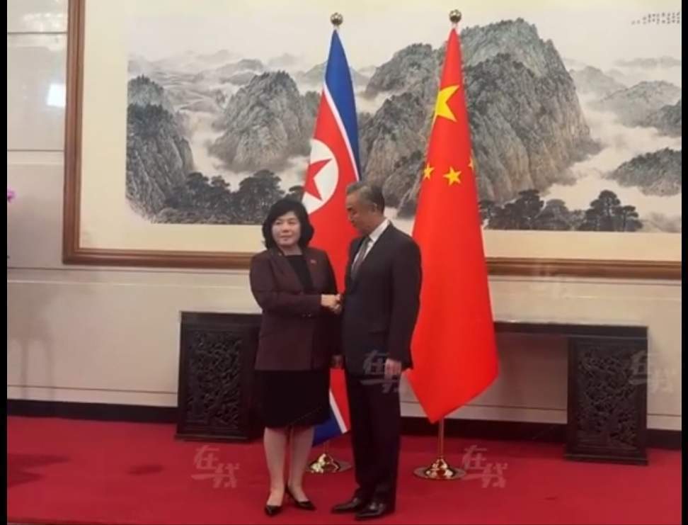 28일 베이징서 만난 최선희 북한 외무상(왼쪽)과 왕이 중국 외교부장. CGTN 갈무리