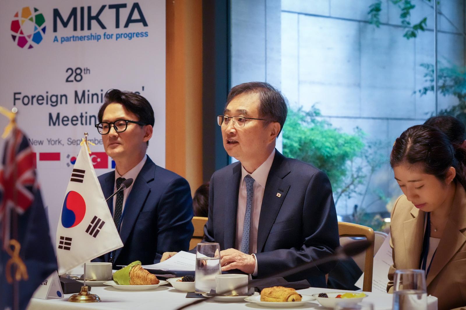 조현 외교부 장관이 25일(현지시간) 미국 뉴욕에서 열린 제28차 믹타(MIKTA) 외교장관회의를 주재하고 있다. 이번 회의는 우리나라가 믹타 12대 의장국을 수임한 이후 처음으로 열린 외교장관회의이다. (외교부 제공)