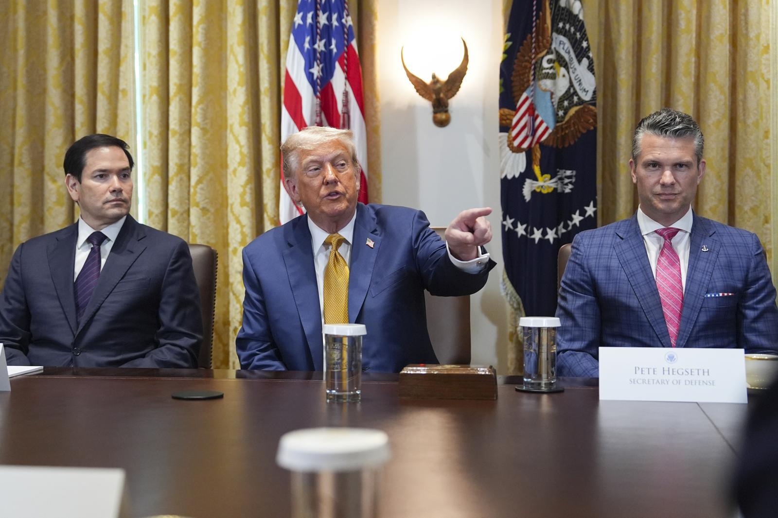 올해 7월 8일 미 워싱턴 백악관에서 열린 내각 회의에서 도널드 트럼프 대통령(가운데)이 발언하고 있다. 마크 루비오 국무장관(왼쪽)과 피트 헤그세스 국방장관이 트럼프 대통령의 양옆에 앉았다. 워싱턴=AP 뉴시스