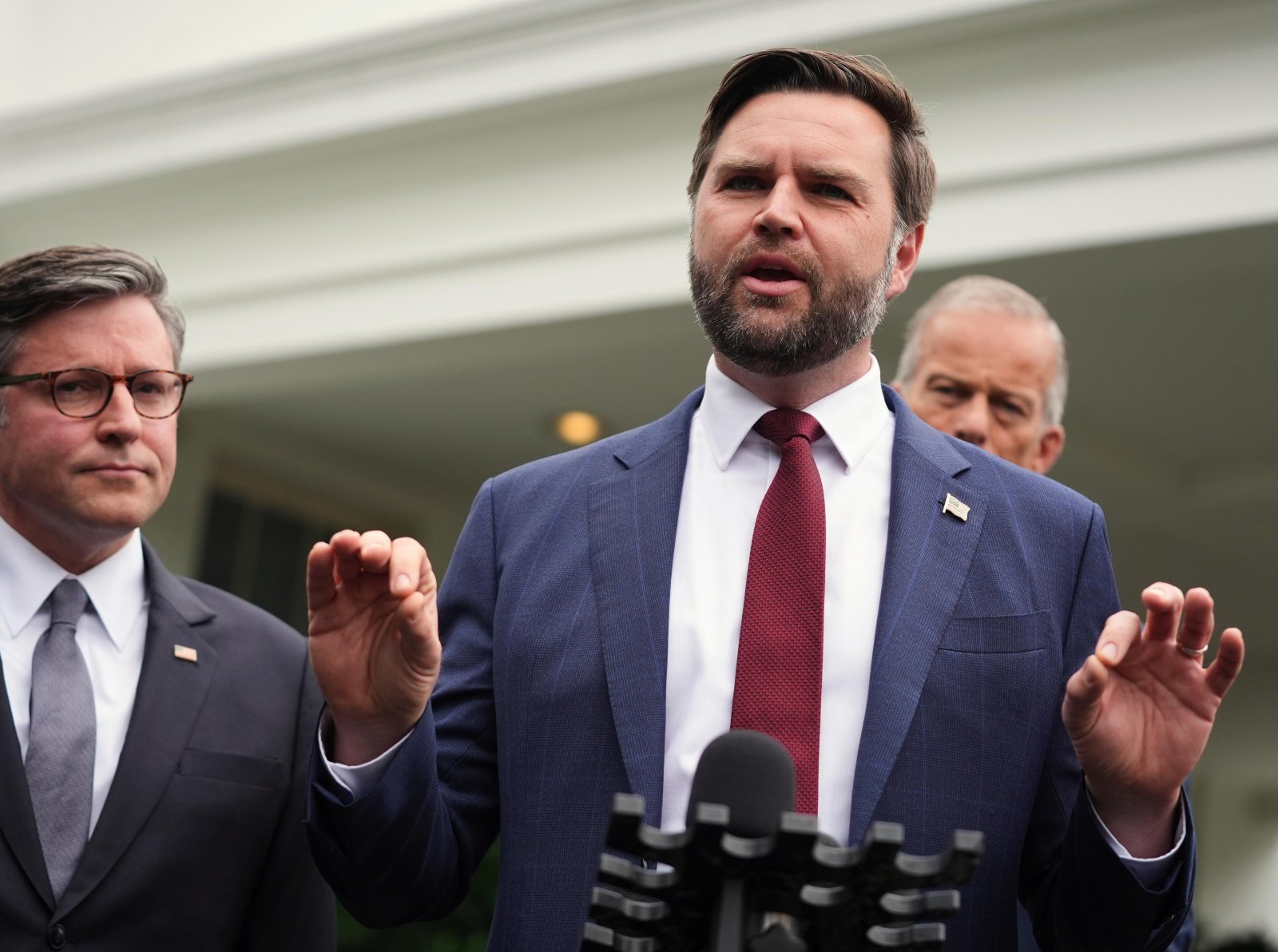 마이크 존슨 미국 하원의장, J D 밴스 부통령, 존 슌 집권 공화당 상원 원내대표(왼쪽부터)가 지난달 29일 워싱턴 백악관에서 야당 민주당 지도부와 회동했지만 임시 예산안 처리에 실패했다. 밴스 부통령이 그 책임을 민주당에 돌리는 기자회견을 하고 있다. 워싱턴=AP 뉴시스