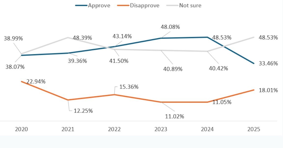 도널드 트럼프 행정부의 한미 관계 대응에 관한 미국 국민의 지지율은 33.4%로 역대 최저치를 보였다. 지난해 48.5%까지 올랐던 지지율이 15%포인트 가량 추락했다.