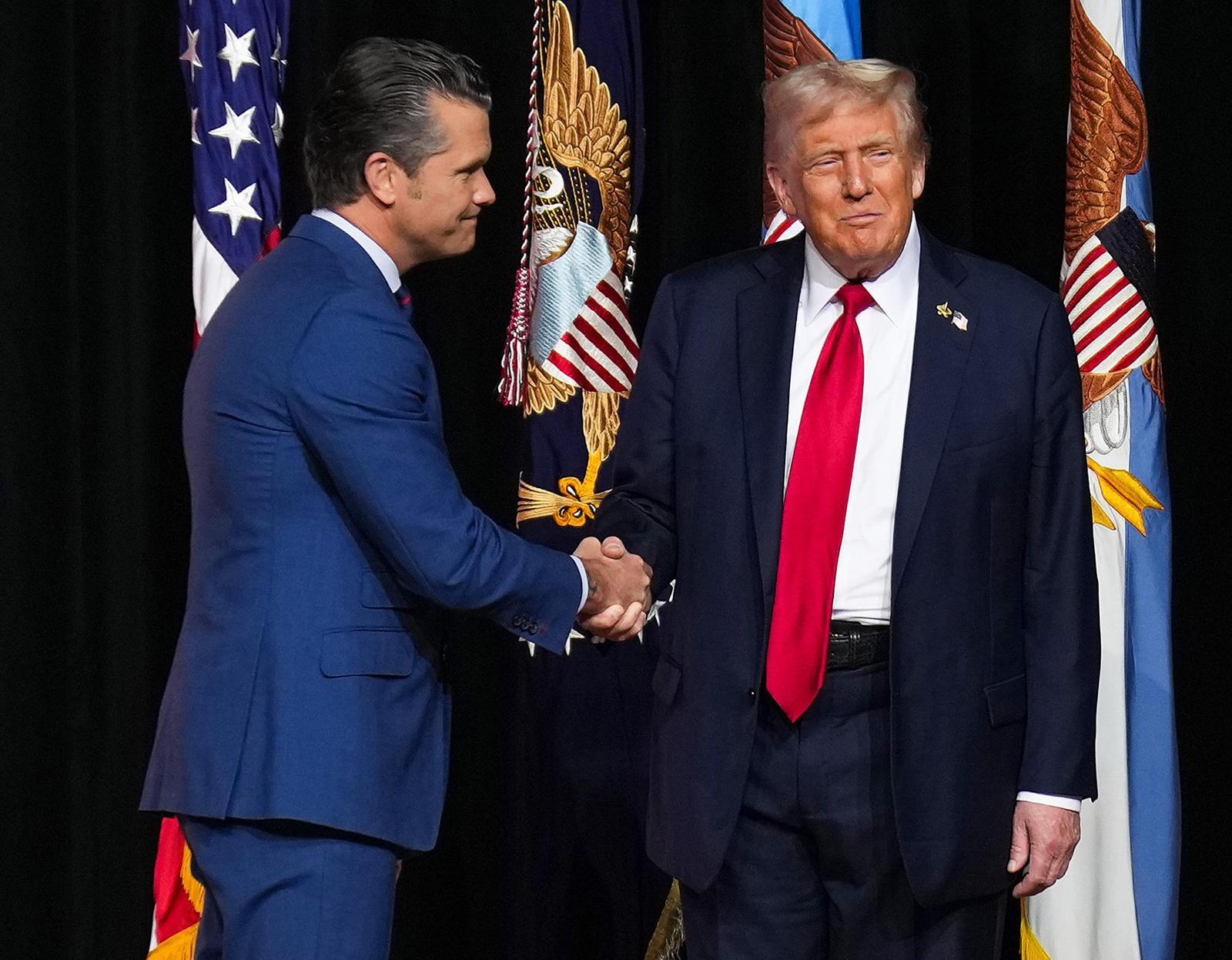 지난달 30일 미국 버지니아주 콴티코 기지에서 열린 ‘전군 장성급 지휘관 회의’에서 도널드 트럼프 미국 대통령(오른쪽)과 피트 헤그세스 국방장관이 악수를 나누고 있다. 콴티코=AP 뉴시스
