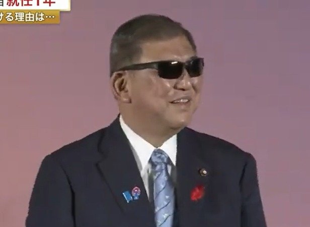 1일 오후 일본 메가네(안경) 베스트 드레서 표창식에 정계 부문 수상자 자격으로 참석한 이시바 시게루 총리가 부상으로 받은 선글라스를 착용해 보고 있다. (사진=FNN 보도 갈무리)