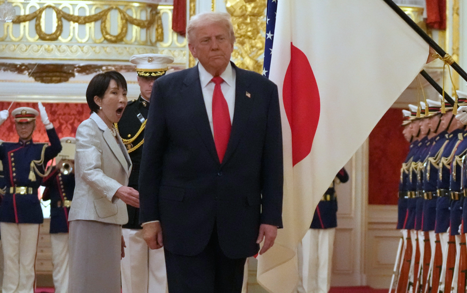 이날 트럼프 대통령은 의장대 사열 도중 잠시 어디로 갈 지 방향을 잃어 다카이치 총리가 허리에 손을 얹고 그를 안내하는 모습이 포착됐다. 이어 양국 국기에 대한 예우 절차에서 또 다른 해프닝이 이어졌다. 트럼프 대통령이 먼저 게양돼 있던 성조기를 향해 즉흥적으로 거수경례를 하자, 다카이치 총리도 반사적으로 가슴에 손을 얹어 예를 표했다. 그러나 이어진 일장기 예우 순서에서 트럼프 대통령은 다카이치 총리의 손짓에도 불구하고 그대로 국기를 스쳐 지나갔다. 이에 당황한 다카이치 총리의 표정이 현장 영상과 사진에 그대로 담겼다.
