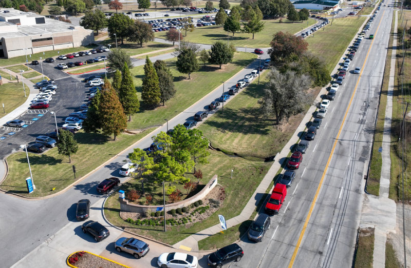 식료품 받으려 길게 늘어선 차 6일 미국 오클라호마주 털사에서 열린 식품 지원 행사에 참여하려는 시민들의 차량들이 도로를 따라 길게 줄지어 서 있다. 최근 미 연방정부의 셧다운 사태로 취약계층을 위한 영양보충지원프로그램(SNAP)이 중단된 여파다. 털사=AP 뉴시스