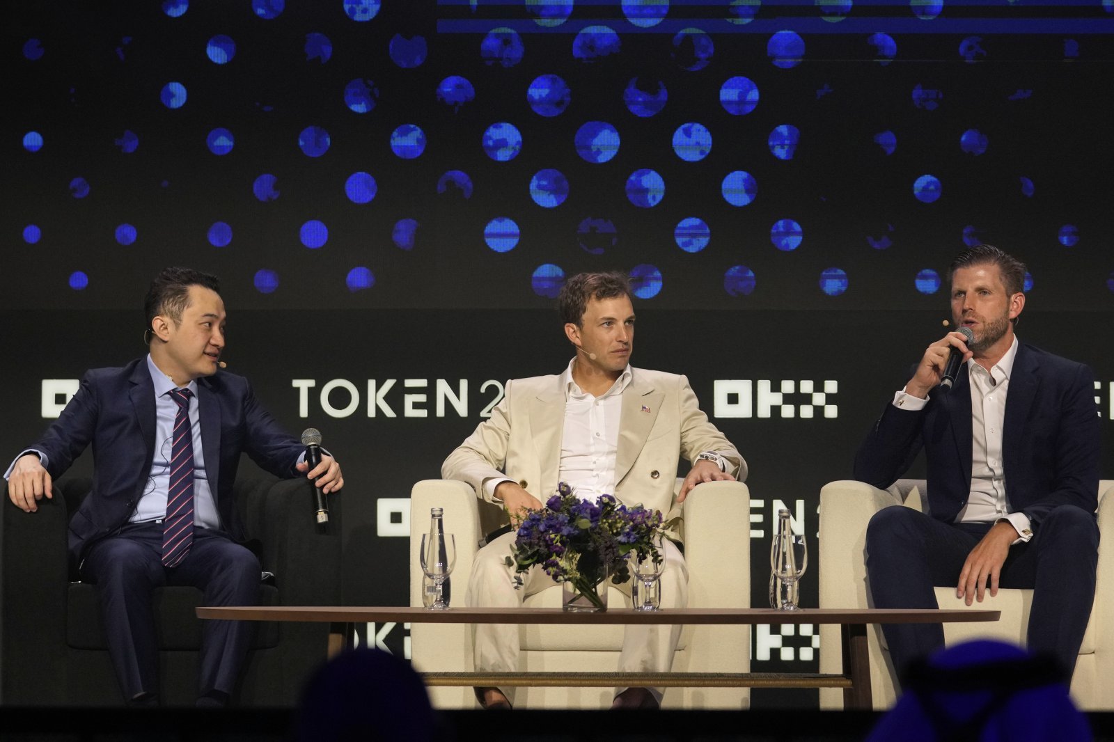 트럼프 오가니제이션 부사장인 도널드 트럼프 미 대통령의 아들 에릭 트럼프(오른쪽)과 트럼프 일가의 암호 화폐 회사 월드 리버티 파이낸셜의 공동 설립자인 잭 위트코프(가운데), 암호 화폐 회사 트론 설립자 저스틴 선이 지난해 5월1일(현지시각) 두바이에서 열린 암호화폐 행사에서 대규모 거래 성사 사실을 발표하고 있다. 트럼프와 일가가 대통령 권한을 이용해 최소 14억 달러 이상을 벌어들였다고 미 뉴욕타임스(NYT)가 20일 보도했다.[두바이=AP/뉴시스]