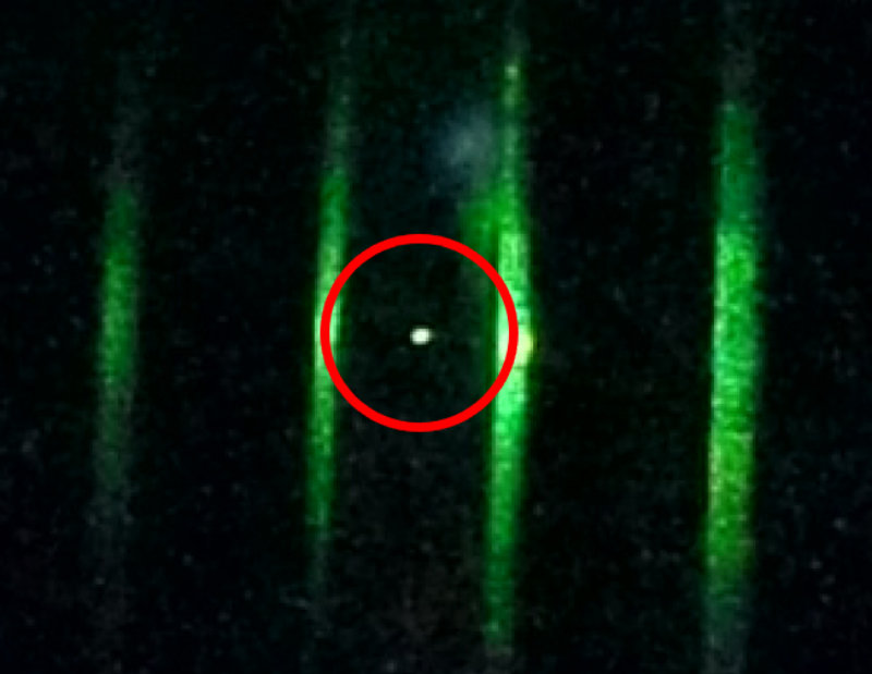 137나노미터 크기의 유리 입자(가운데 하얀 점)가 초록색으로 보이는 레이저 빔 사이에 떠 있다. Kamba et al.(2025)·사이언스 제공