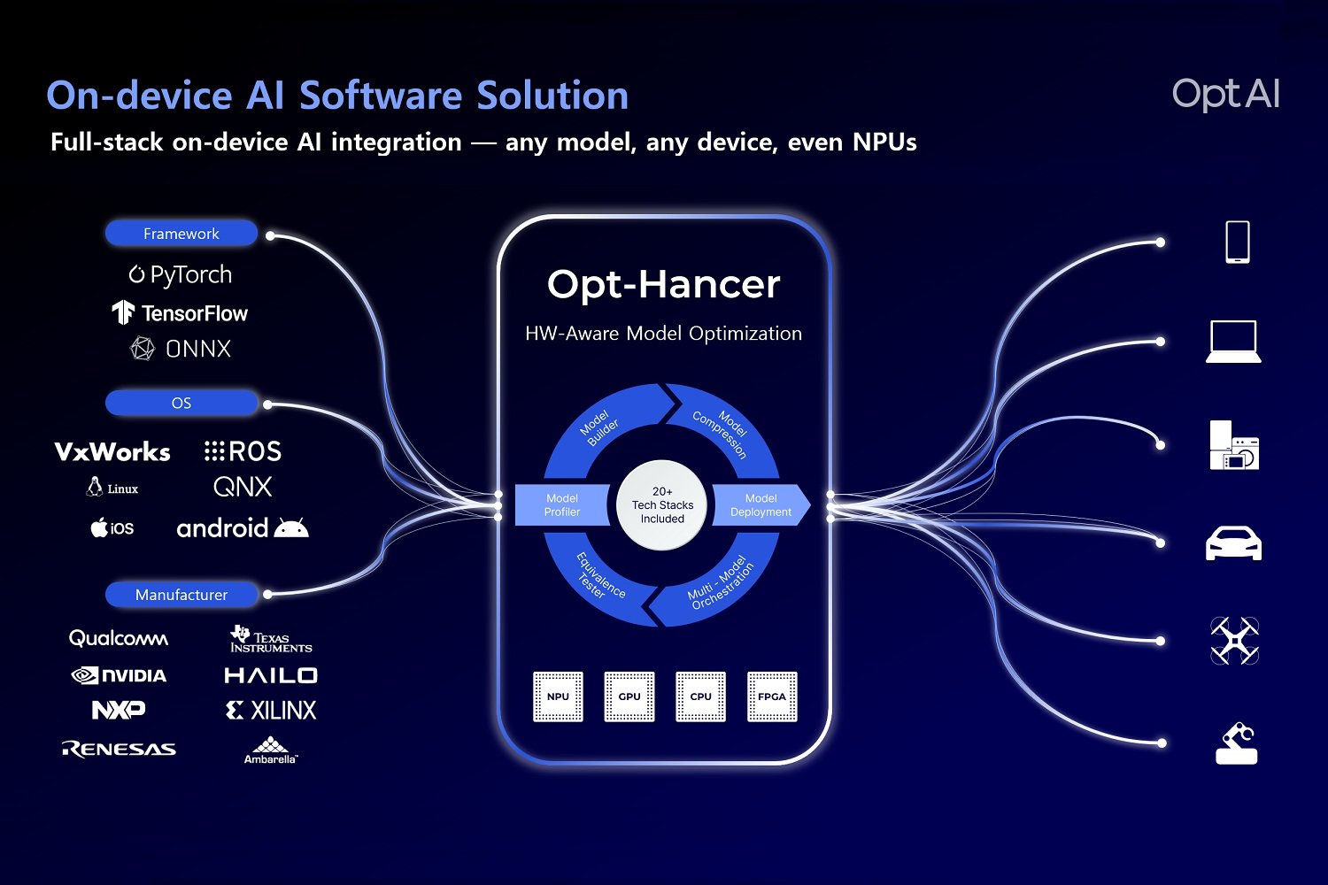하드웨어 인지 자동화 소프트웨어 플랫폼 스타트업 옵트에이아이(대표 이재호)가 온디바이스 AI 최적화 플랫폼, 옵트핸서(OptHancer)로 ‘CES 2026 인공지능 부문 혁신상’을 수상했다. 클라우드에 의존하지 않고 스마트폰이나 태블릿 같은 기기 자체에서 AI를 구동하는 온디바이스 AI 기술이 주목받는 시점에서 나온 성과다.