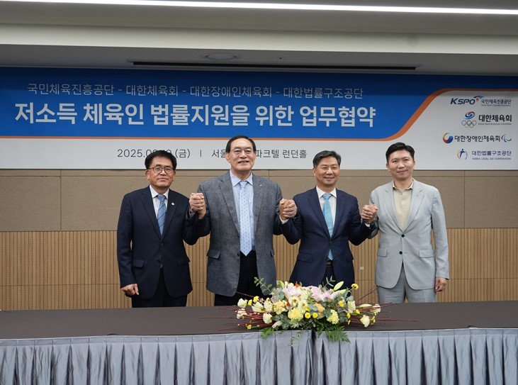 한법률구조공단(이사장 김영진)이 19일 서울올림픽파크텔에서 국민체육진흥공단(이사장 하형주), 대한체육회(회장 유승민), 대한장애인체육회(회장 정진완)와 ‘저소득 체육인 대상 법률지원’을 위한 업무협약을 체결했다.