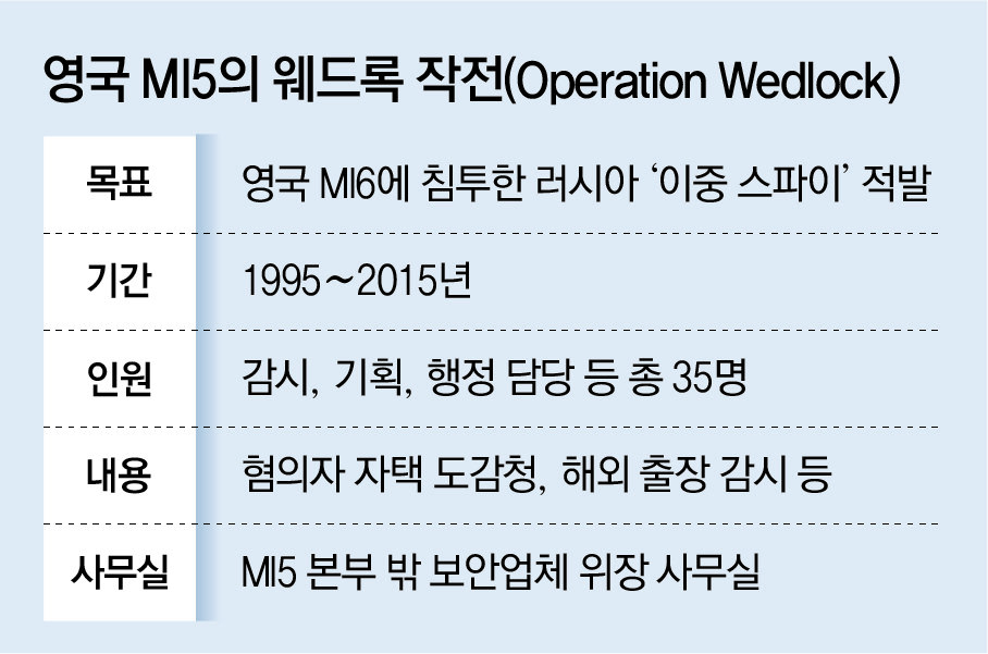 가디언에 따르면 MI5는 MI6에 파고든 이중 스파이를 잡기 위해 감시, 기획, 행정 담당 등 총 35명의 요원들로 구성된 팀을 2015년까지 20년간 운영했다. 시작은 “런던에서 근무 중인 MI6 요원이 러시아에 비밀을 넘기고 있다”는 미 중앙정보국(CIA) 제보에서 비롯됐다. 당시 MI6에 근무 중인 2500명의 요원 중 한 명이 이른바 ‘두더쥐(mole·이중 스파이를 뜻하는 정보계 은어)’라는 것. 특히 1998∼1999년 러시아 연방보안국(FSB·KGB의 후신)의 수장은 블라디미르 푸틴 현 러시아 대통령이었다.
