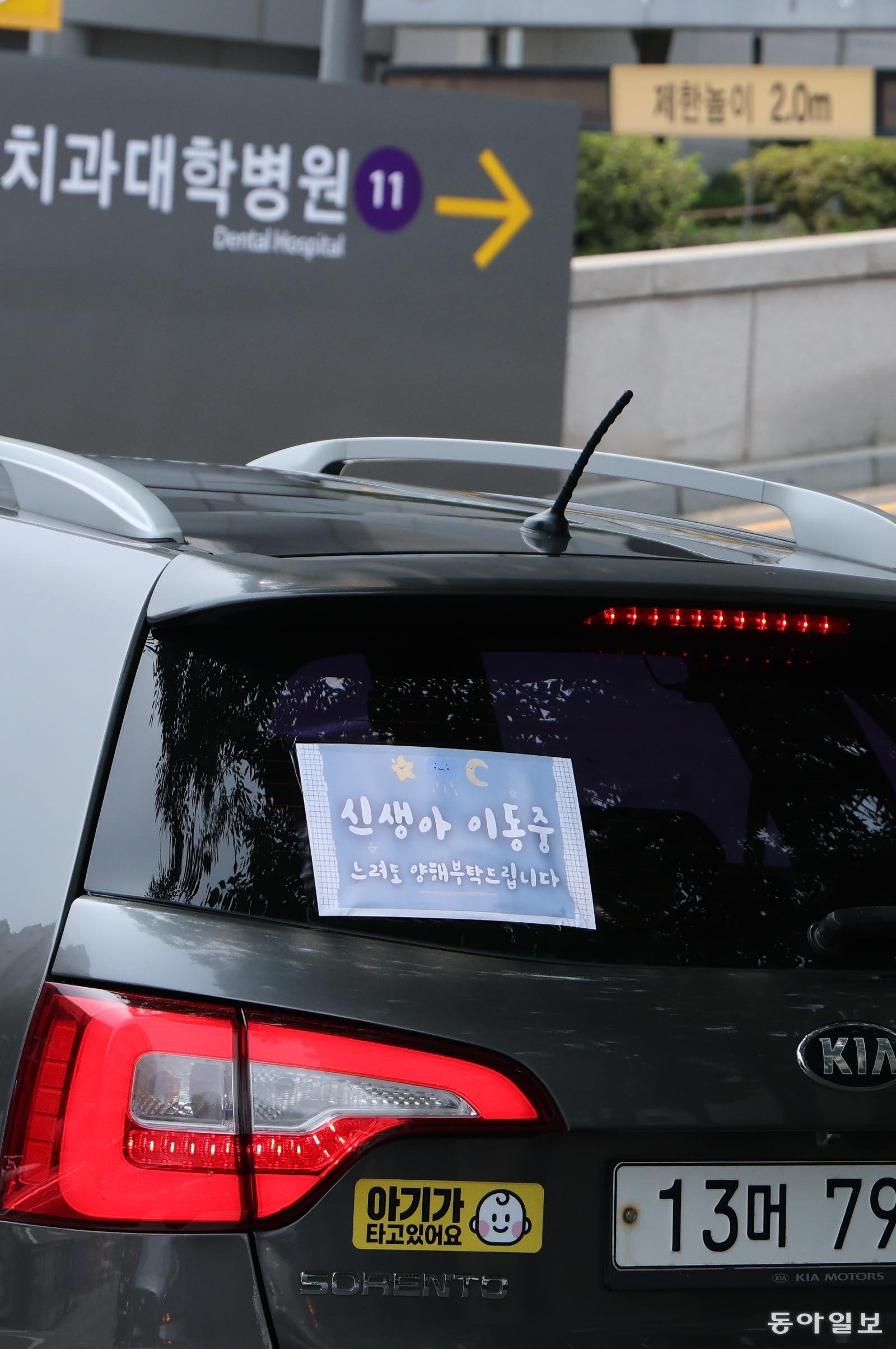 ‘신생아 이동 중’이라고 적힌 안내문이 앞 차량에 붙어 있네요. 빛을 본 지 며칠 안 된 아기를 놀라게 할 순 없지요. 아기의 안전을 지켜 주세요∼.