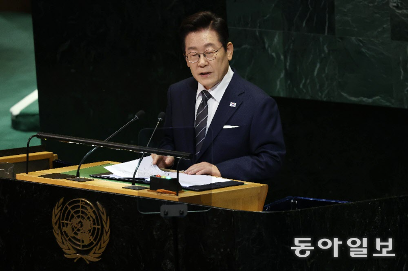 이재명 대통령이 23일(현지시간) 미국 뉴욕 유엔 총회장에서 기조연설을 하고 있다. 뉴욕=송은석 기자 silverstone@donga.com