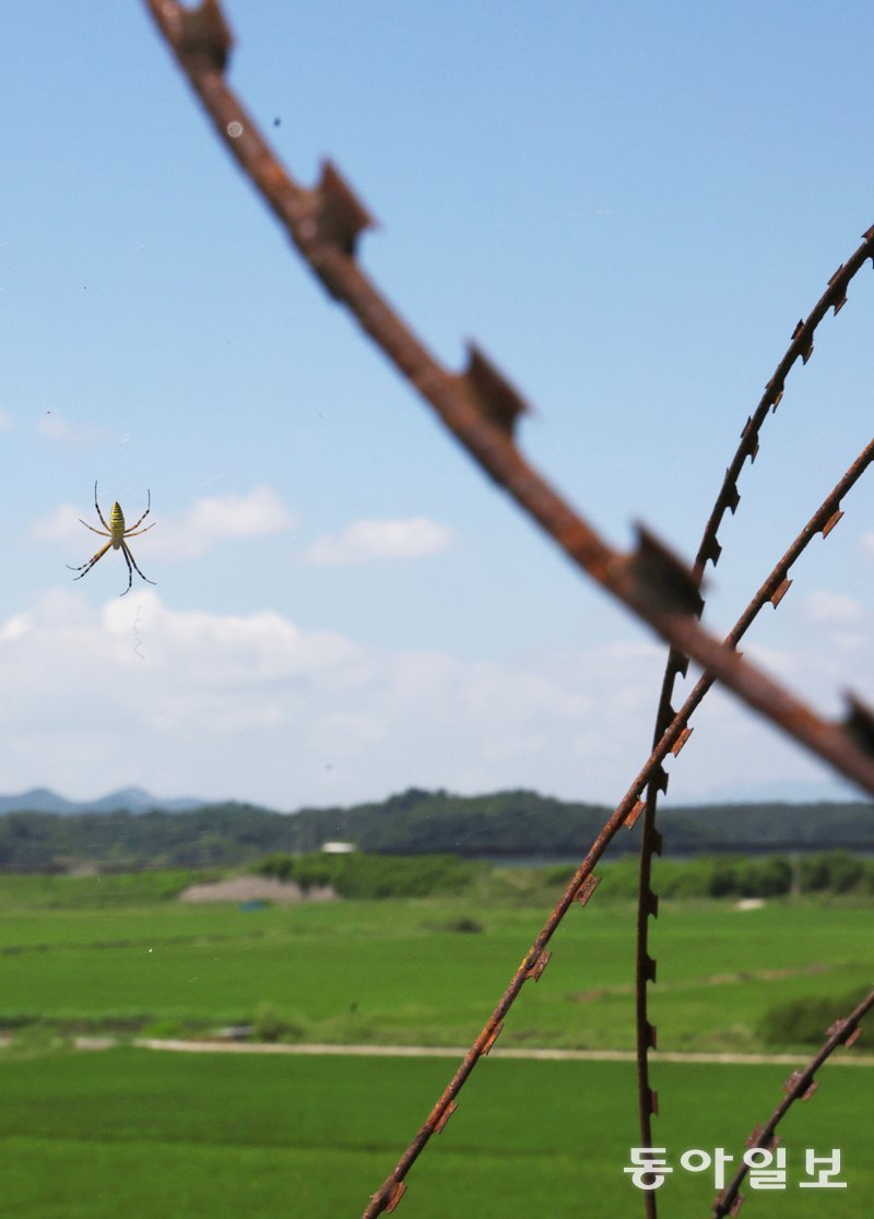 철조망이 금단의 땅을 넘는 사람을 경계하고, 거미줄이 틈새를 노려 공중낙하하는 벌레를 붙잡습니다. 물샐틈없는 콤비 수비력을 자랑하네요.