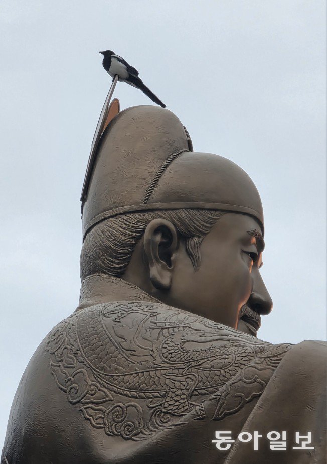 세종대왕 동상의 곧게 솟은 익선관 위로 까치 한 마리가 앉아 있습니다. 임금에게 자신이 직접 보고 들은 민심을 전해 주는 듯하네요.