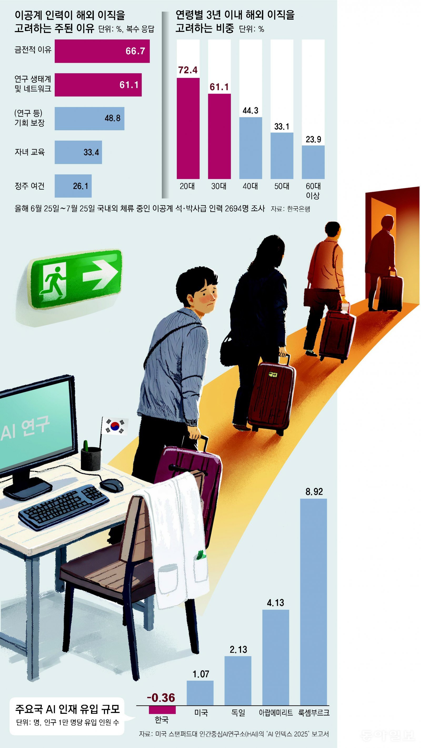 과학기술 인재에 대한 열악한 처우와 연구개발(R&D) 예산 삭감 등 불안정한 연구 환경 탓에 그나마 남은 인재들마저 해외로 떠나고 있다. 최근 한국은행이 국내 석박사급 이공계 인력 2700여 명을 설문 조사해 보니 43%가 3년 내 해외 이직을 고려하고 있었다. 특히 인공지능(AI) 분야에서 한국은 경제협력개발기구(OECD) 38개국 중 네 번째로 인재 순유출이 많은 국가다.