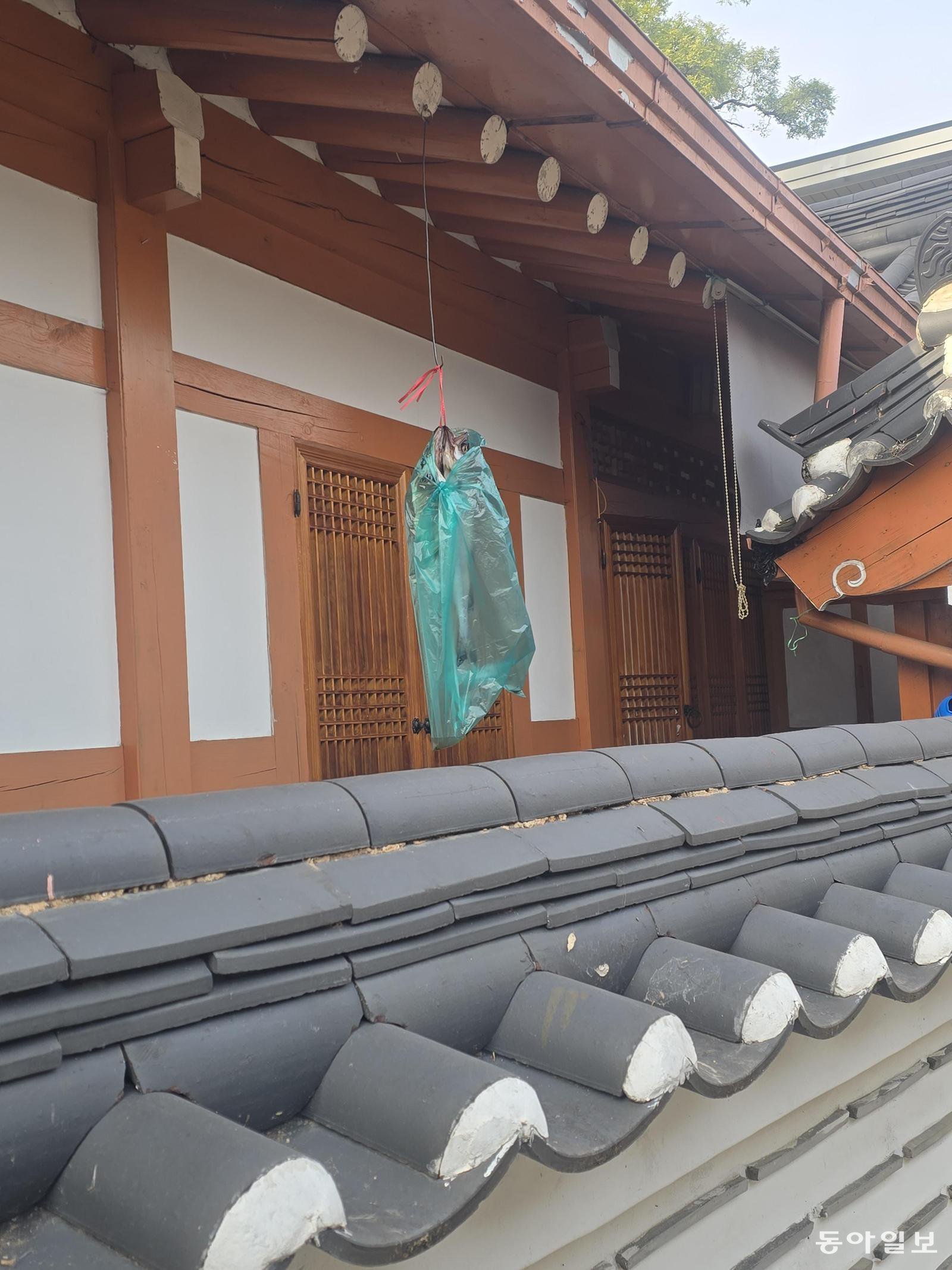 도심 한옥 처마 밑에 매달린 명태가 초록 비닐 속에서 겨울을 기다립니다. 옛 방식과 요즘 물건이 한데 섞여 묘한 조화를 이룹니다.