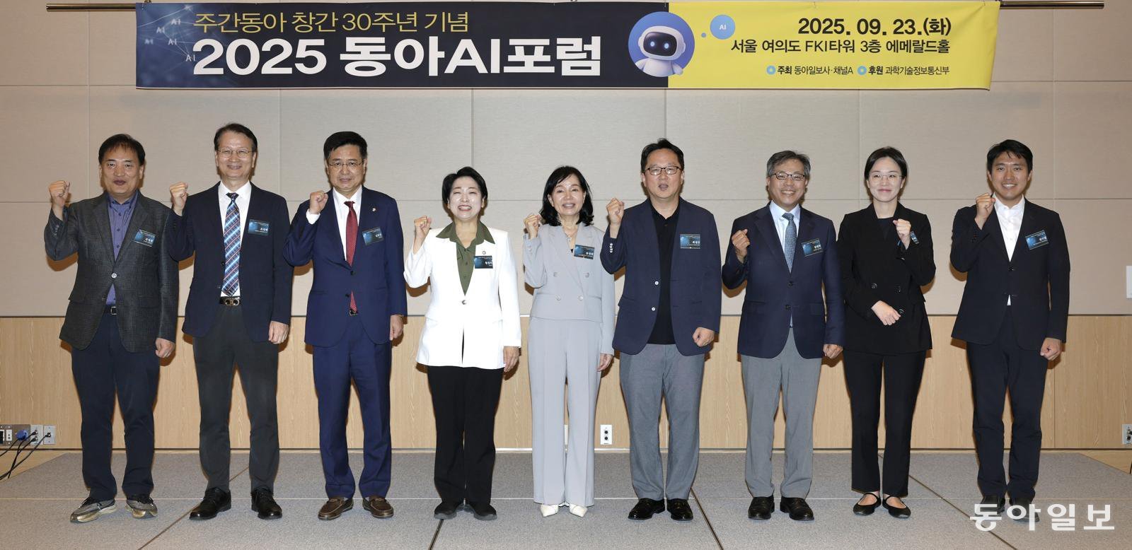 주간동아 창간 30주년을 맞아 23일 서울 영등포구 여의도 FKI타워 콘퍼런스센터에서 ‘2025 동아AI포럼’이 개최됐다. 동아일보와 채널A가 공동 주최한 이번 포럼에서는 ‘소버린 AI의 길을 찾다’를 주제로 깊이 있는 논의가 진행됐다. 왼쪽부터 김정훈 동아일보 출판편집인, 조성배 연세대 교수, 국민의힘 김장겸 의원, 더불어민주당 황정아 의원, 송경희 성균관대 AI신뢰성센터장, 최정규 LG AI연구원 AI에이전트그룹장, 장병탁 서울대 교수, 송단비 산업연구원 연구위원, 장기철 과학기술정보통신부 인터넷진흥과장.