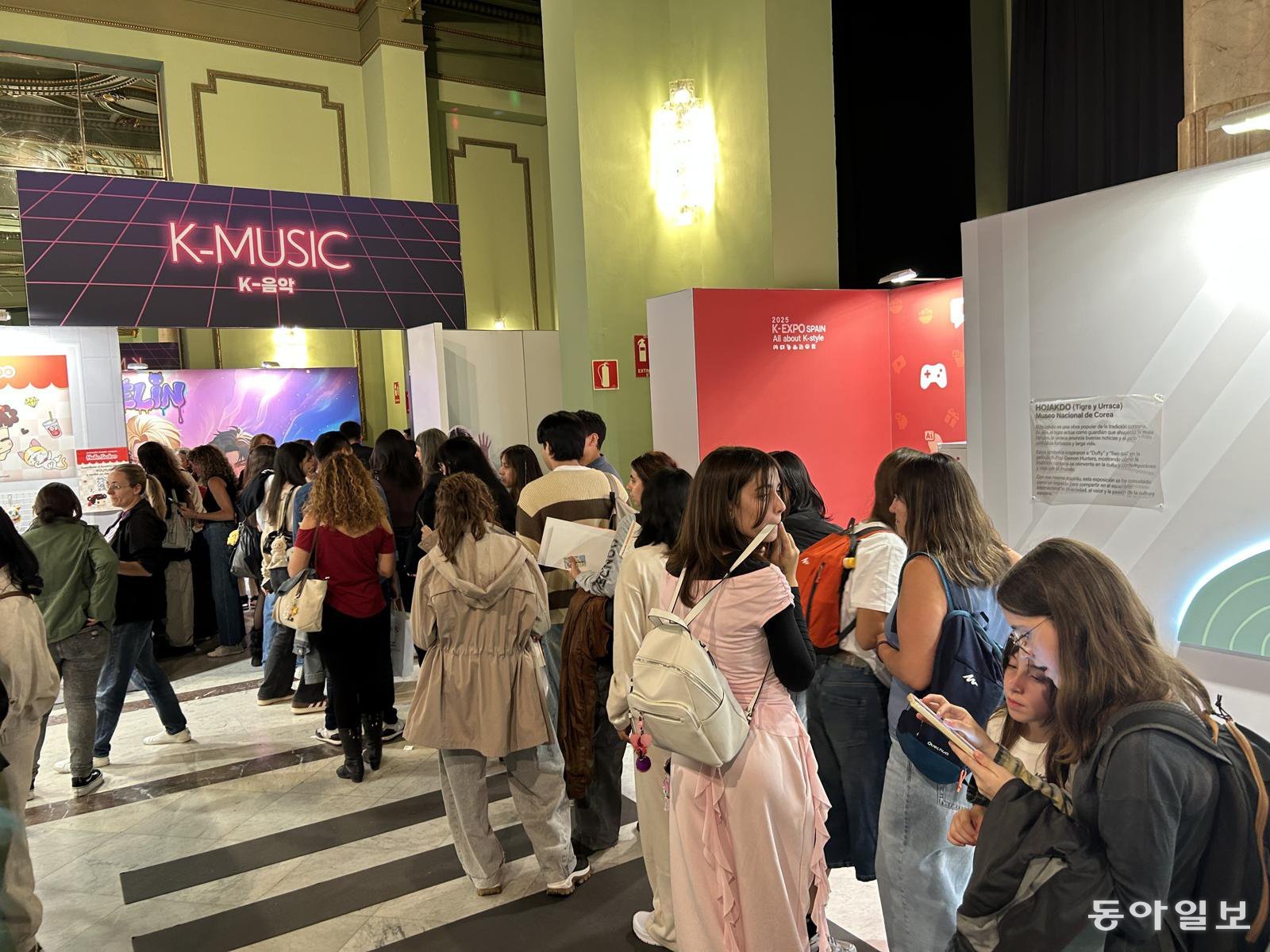 지난달 28일 스페인 마드리드 아르테스 예술센터에서 열린 ‘2025 K-엑스포’에서 관람객들이 K뮤직관에 입장하기 위해 긴 줄을 서고 있다. 마드리드=유근형 특파원 noel@donga.com