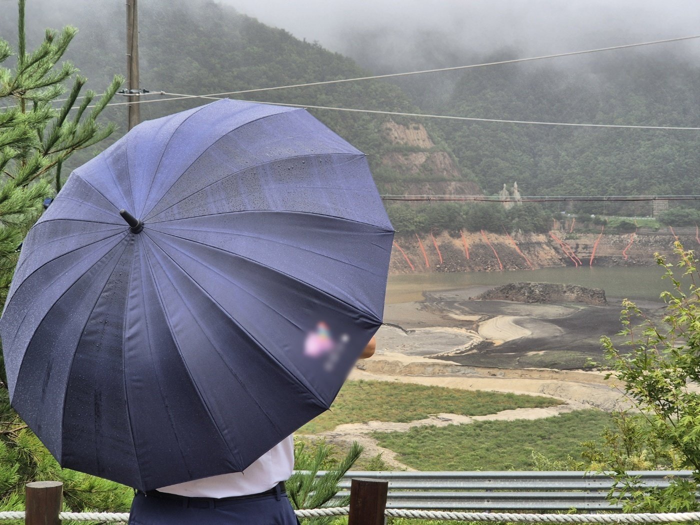 극심한 가뭄을 겪고 있는 강원 강릉지역에 많은 비가 내린 지난 13일 오전 우산을 쓴 시민이 마른 저수지에 내리는 단비를 바라보고 있다. 2025.9.13/뉴스1