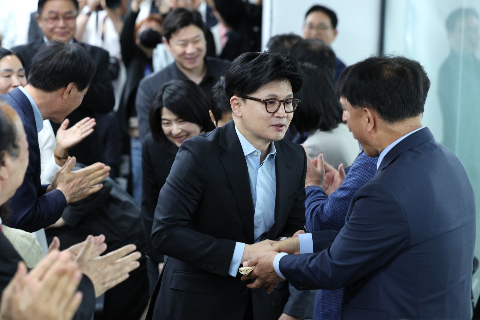 한동훈 전 국민의힘 대표가 27일 오후 서울 여의도 국민의힘 서울시당에서 열린 국민의힘 서울 광역·기초의원 간담회에 참석하며 참석자들과 인사하고 있다. 2025.4.27/뉴스1