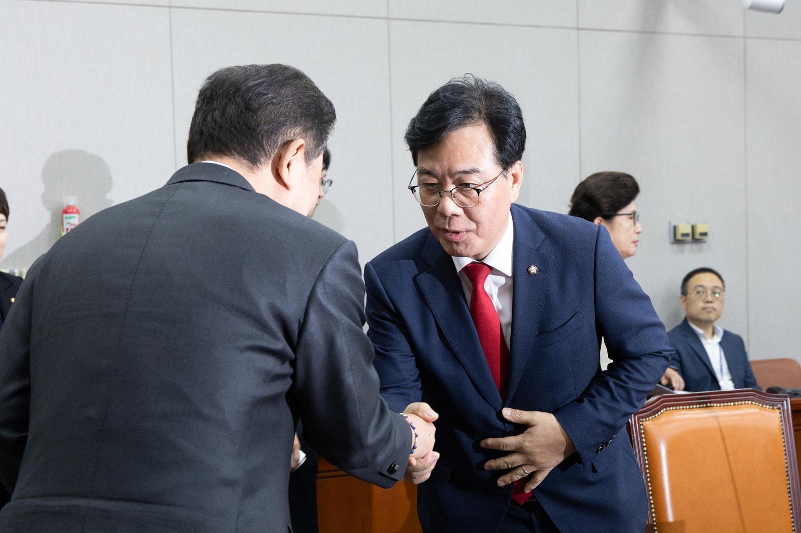 김병기 국회 운영위원장이 22일 서울 여의도 국회에서 열린 제429회국회(정기회) 제1차 전체회의에서 송언석 국민의힘 원내대표와 악수하고 있다. 2025.9.22/뉴스1