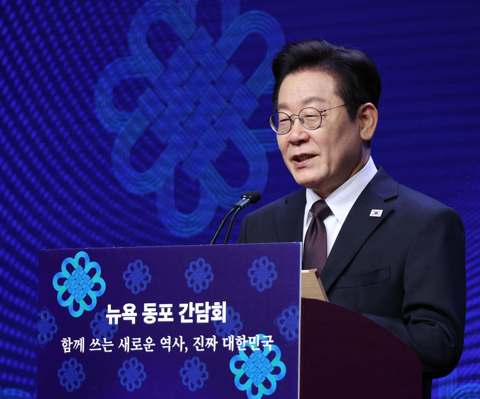 [뉴욕=뉴시스] 최동준 기자 = 이재명 대통령이 22일(현지 시간) 미국 뉴욕의 한 호텔에서 열린 동포 간담회에서 인사말을 하고 있다. 2025.09.23. photocdj@newsis.com