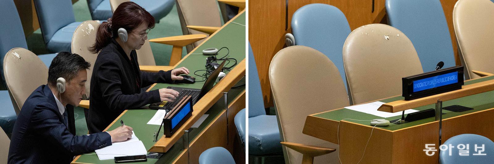 (왼쪽 사진)이재명 대통령이 23일(현지시간) 미국 뉴욕 유엔본부에서 열린 제80차 유엔 총회에서 기조연설을 하고 있는 가운데 중국 대표단이 이 대통령의 발언을 필기하고 있다. 북한 대표단의 자리는 비어 있다. 뉴욕=송은석 기자 silverstone@donga.com