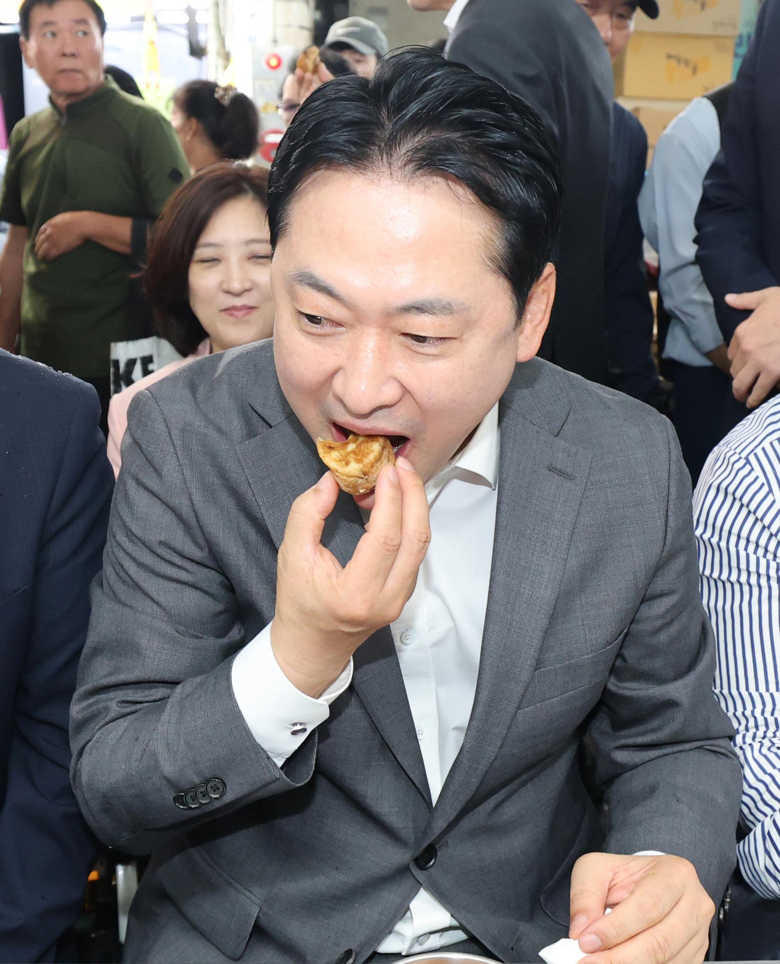 장동혁 국민의힘 대표가 25일 대전 동구 중앙시장을 방문해 풀빵을 시식하고 있다. 2025.9.25/뉴스1