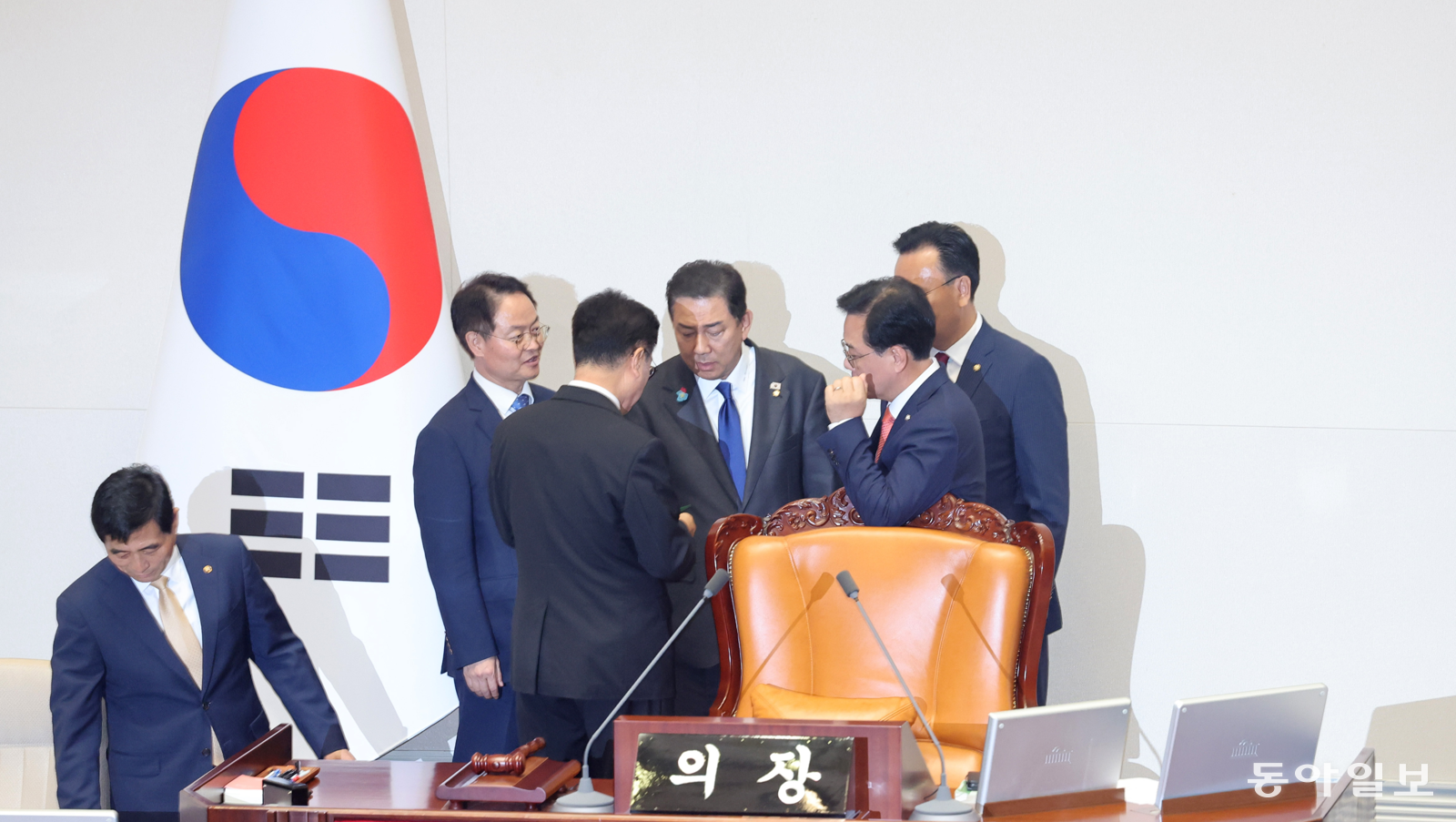 우원식 국회의장과 김병기 더불어민주당 원내대표, 송언석 국민의힘 원내대표가 25일 오후 서울 여의도 국회에서 열린 본회의에서 신속처리안건 지정동의의 건 투표수가 명패수보다 많은 것에 대하여 대화하고 있다. 장승윤 기자 tomato99@donga.com