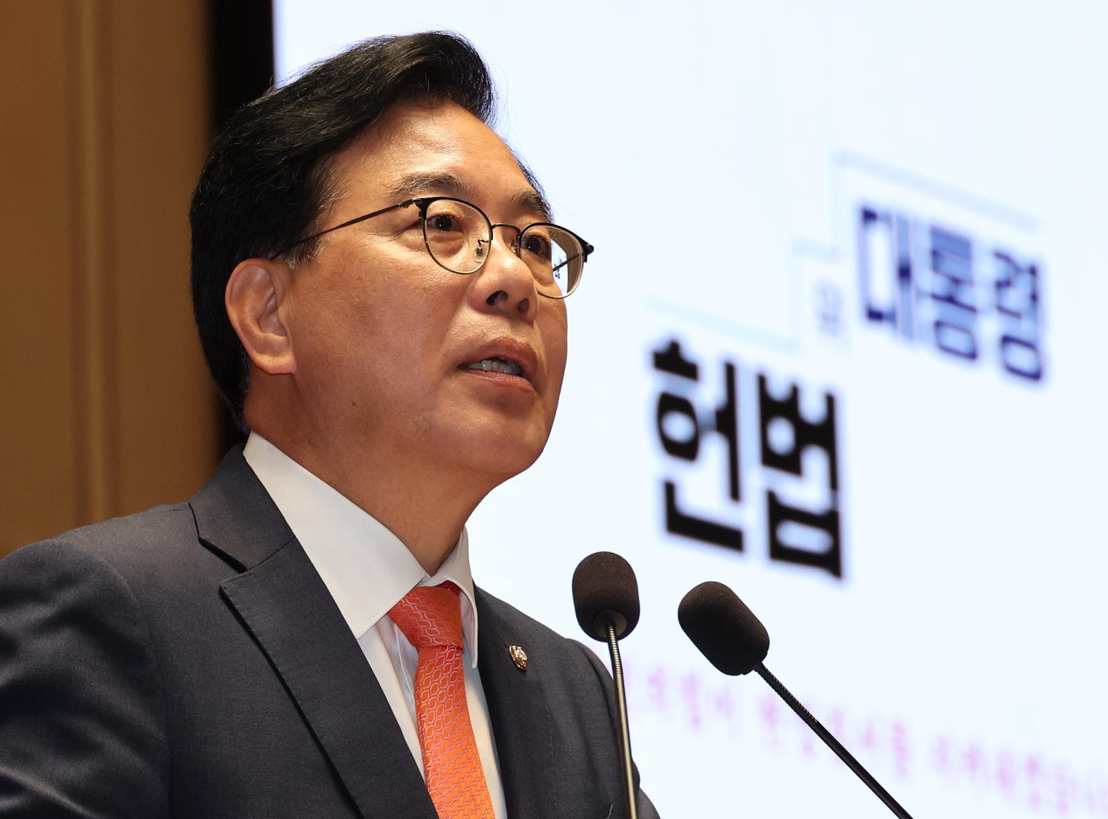 송언석 국민의힘 원내대표가 25일 오후 서울 여의도 국회에서 열린 의원총회에서 발언을 하고 있다. 2025.09.25. [서울=뉴시스]