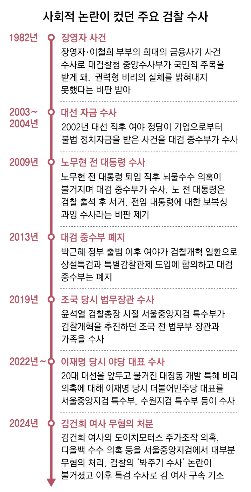 김건희 여사 무혐의 처분윤석열 정부에선 검사 출신들이 주요 보직을 꿰찼고, 검찰은 야당 대표에 대해선 전방위로 수사했다. 반면 윤 전 대통령 부인 김건희 여사의 도이치모터스 주가조작 의혹 등에 대해 무혐의 처분하며 “살아 있는 권력에 대한 수사를 스스로 포기했다”는 비판을 받았다. 결국 불법 비상계엄 선포로 윤 전 대통령이 파면되면서 출범한 특검은 김 여사를 구속해 재판에 넘겼다. 검찰 수사가 부정당한 것이다.