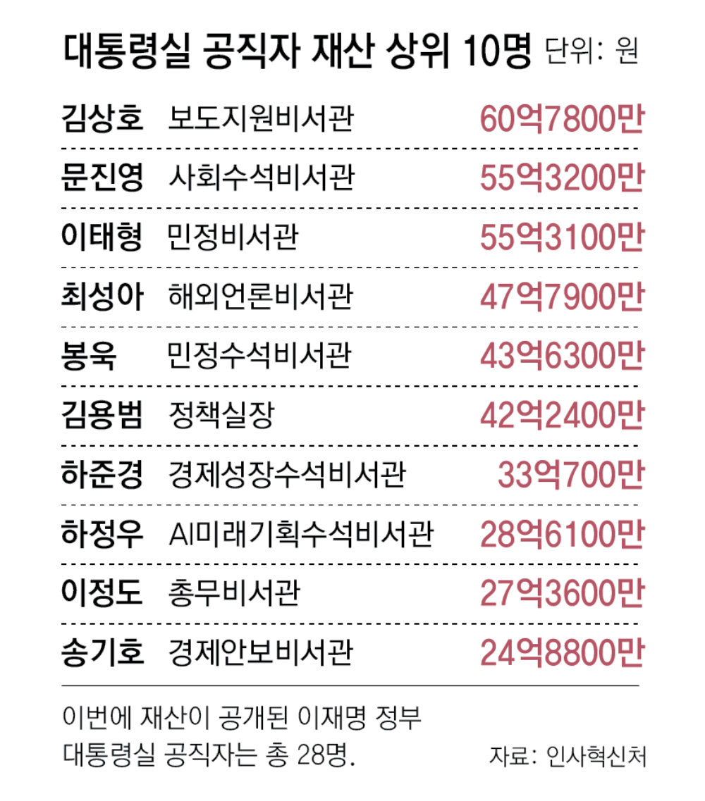 25일 정부공직자윤리위원회가 공개한 고위공직자 수시재산등록사항에 따르면 대통령실 참모진 중 재산 1위는 김상호 보도지원비서관으로 60억7800만 원이었다. 이어 문진영 사회수석비서관(55억3200만 원)과 이태형 민정비서관(55억3100만 원), 최성아 해외언론비서관(47억7900만 원), 봉욱 민정수석비서관(43억6300만 원) 순이었다.