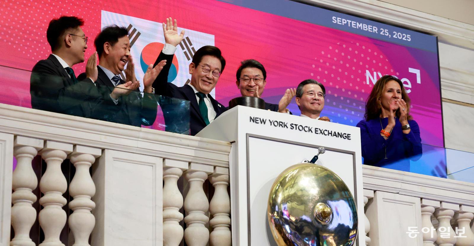 이재명 대통령이 25일(현지 시간) 미국 뉴욕증권거래소(NYSE)에서 개장을 알리는 타종 버튼을 누른 뒤 손을 흔들고 있다. 왼쪽부터 김남준 대통령제1부속비서관, 구윤철 경제부총리 겸 기획재정부 장관, 이 대통령, 이억원 금융위원장, 김용범 대통령령정책실장, 린 마틴 뉴욕증권거래소 회장. 뉴욕=송은석 기자 silverstone@donga.com