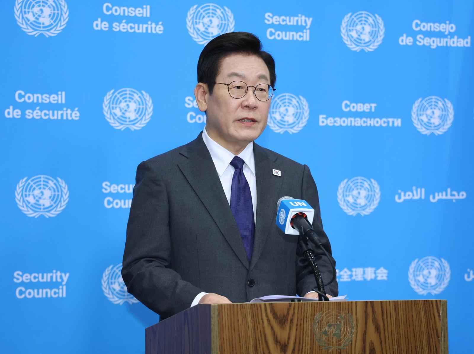 이재명 대통령이 24일(현지 시간) 미국 뉴욕 유엔본부에서 안전보장이사회 의장 자격으로 공개 토의에 앞서 약식 브리핑을 하고 있다. 뉴욕=뉴시스