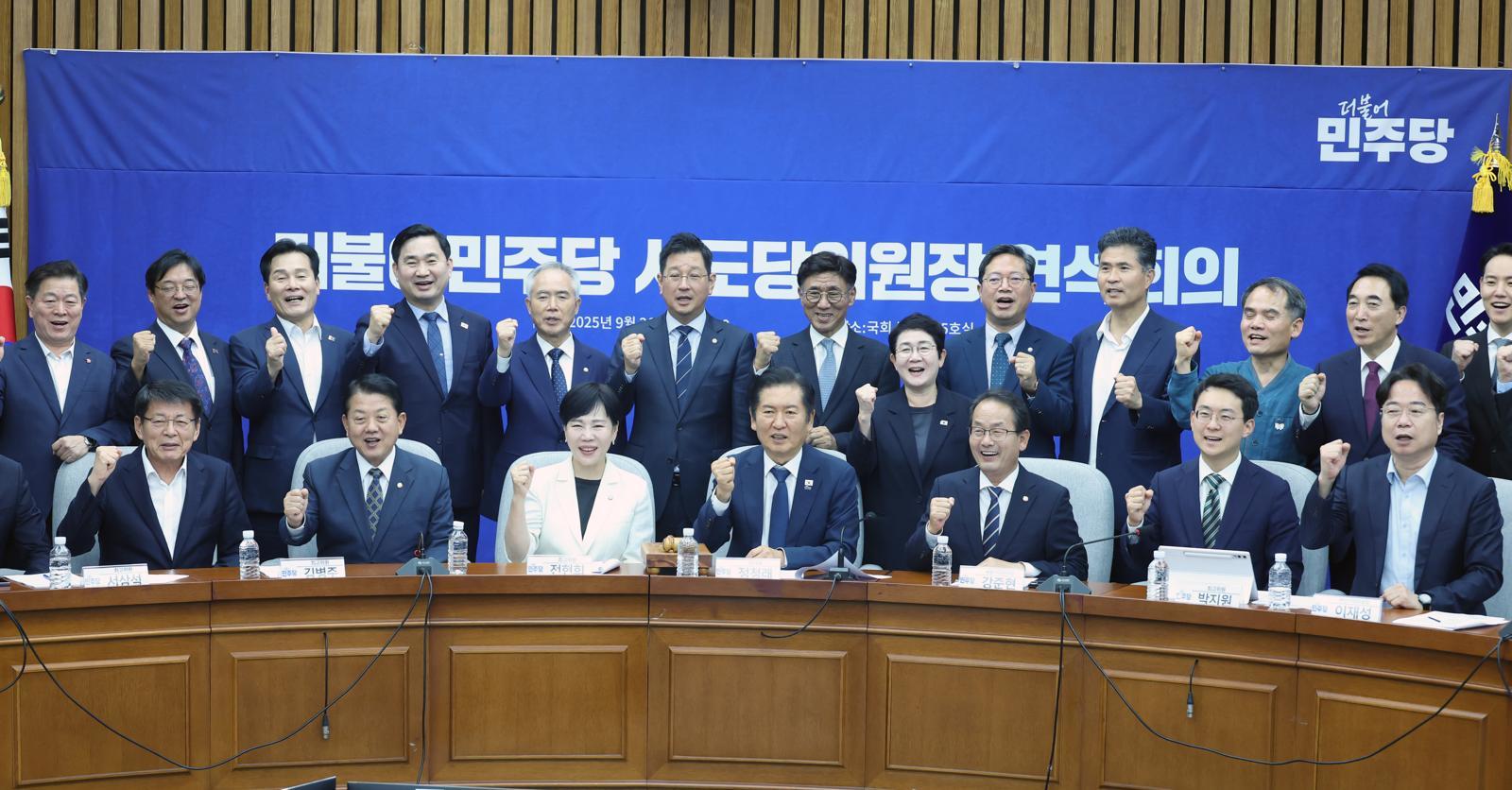 더불어민주당 정청래 대표와 의원 및 시도당위원장들이 26일 서울 여의도 국회에서 열린 시도당위원장 연석회의에서 기념촬영하고 있다. 2025.09.26. [서울=뉴시스]