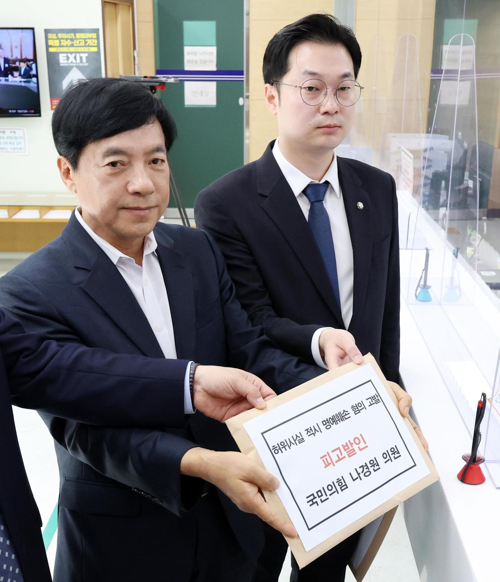 與 “나경원 고발” 더불어민주당 이성윤(왼쪽) 김동아 의원이 26일 오전 서울 종로구 서울경찰청을 찾아 국민의힘 나경원 의원에 대한 허위사실 적시 명예훼손 혐의 고발장을 제출하고 있다. 뉴시스